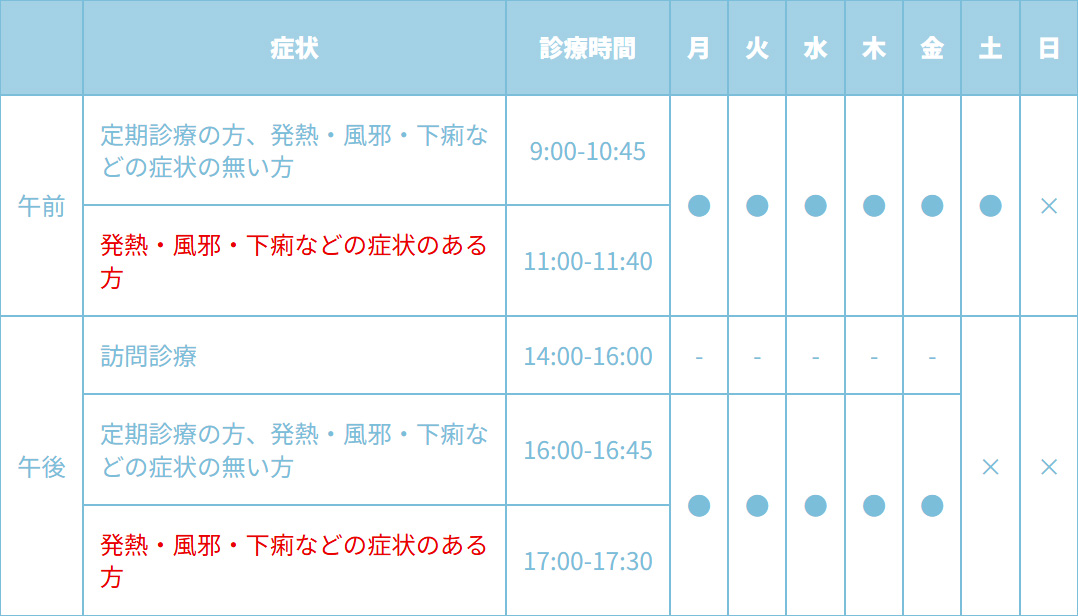 新型コロナウイルス感染症蔓延に伴い、現在診療時間を以下のとおり、風邪症状などがある患者さんと、それ以外の患者さんとで分けています。
